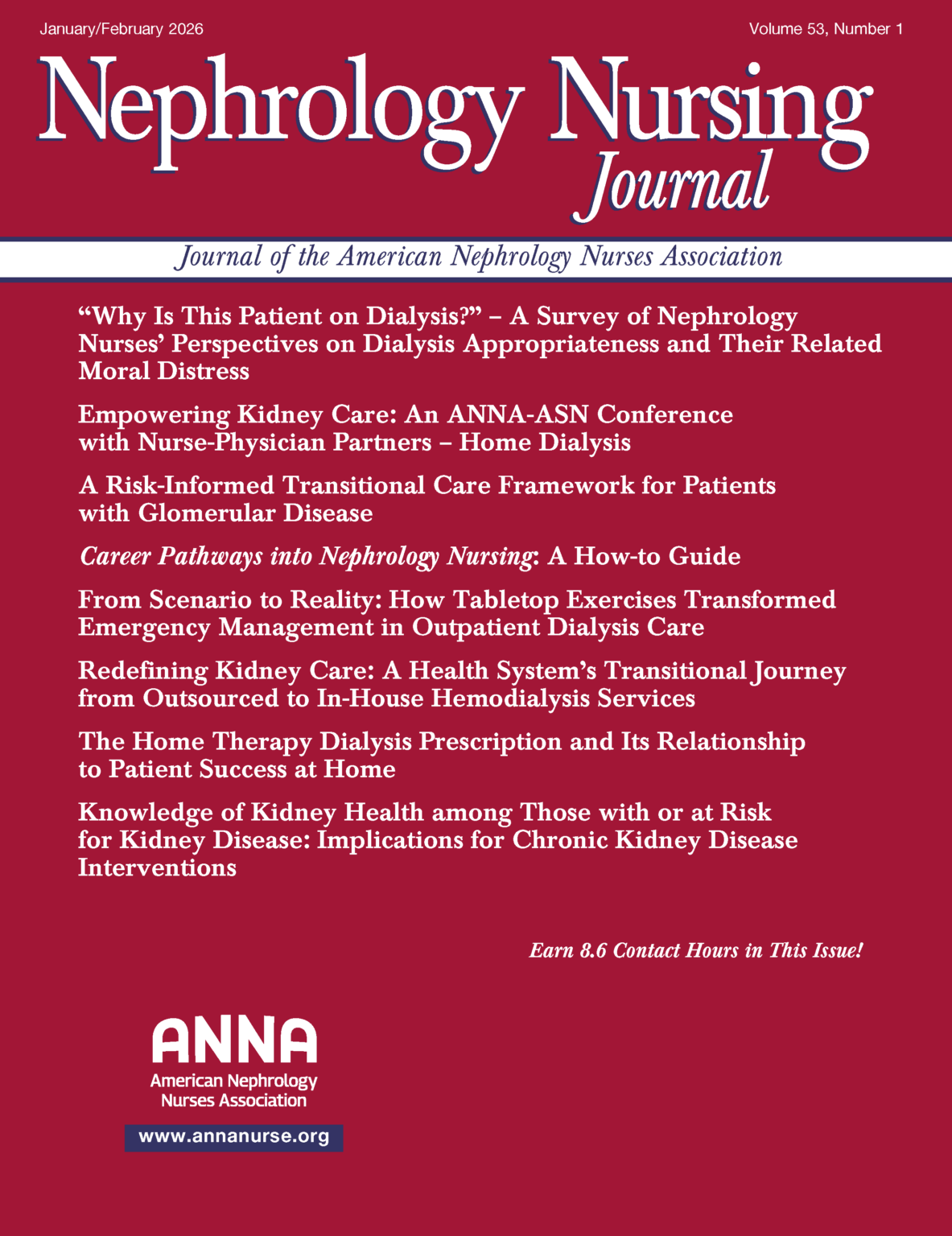 is a refereed clinical and scientific resource that provides current information on a wide variety of subjects to facilitate the practice of professional nephrology nursing.